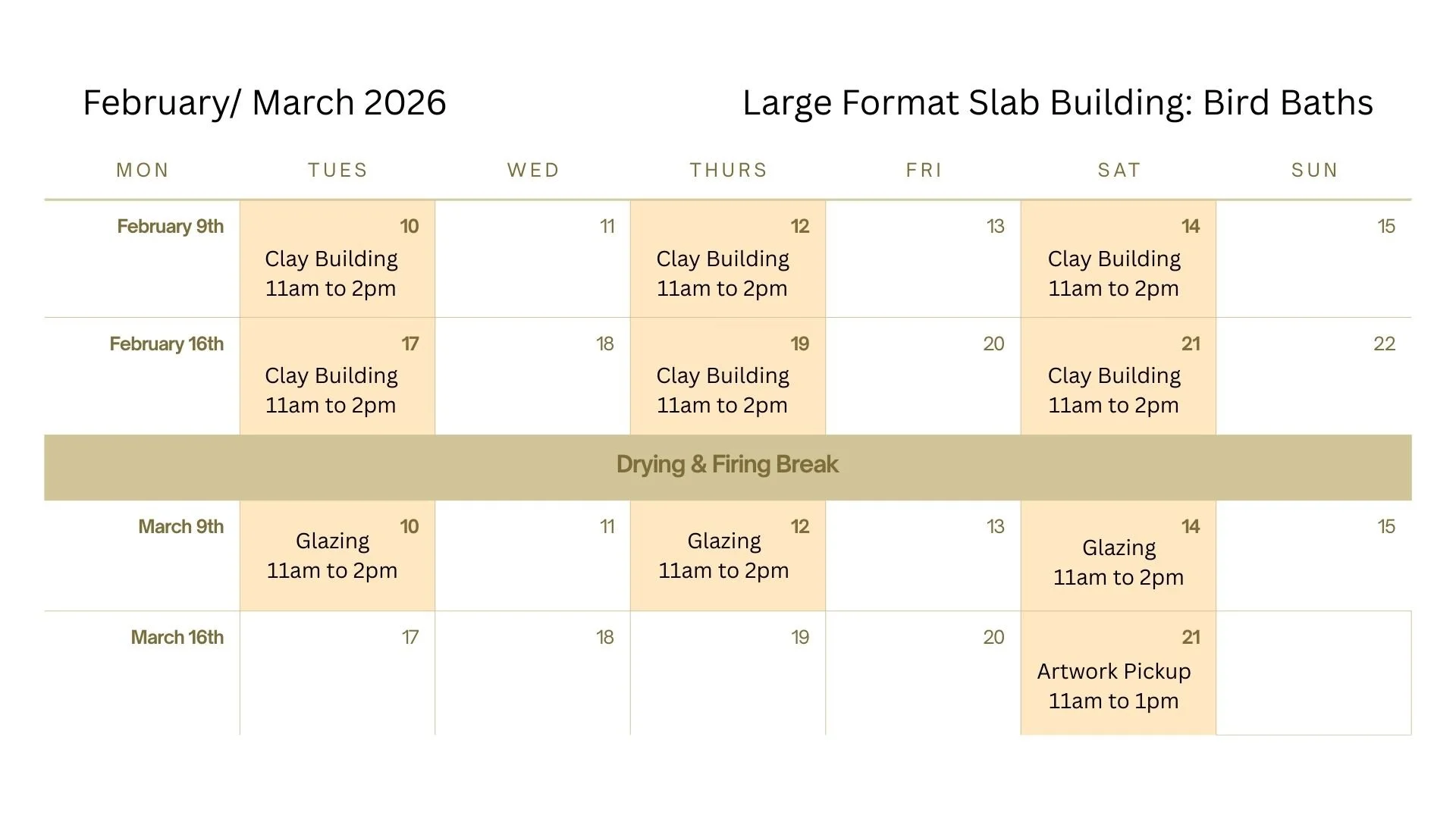 This workshop includes participation in 9 studio sessions. After the workshop, there is an additional gathering where the finished artworks are unveiled and participants can share about their inspirations and experiences. Some participant artworks will be invited to be shown in a brief exhibition at clayARTstudio814 following the end of the workshop series.